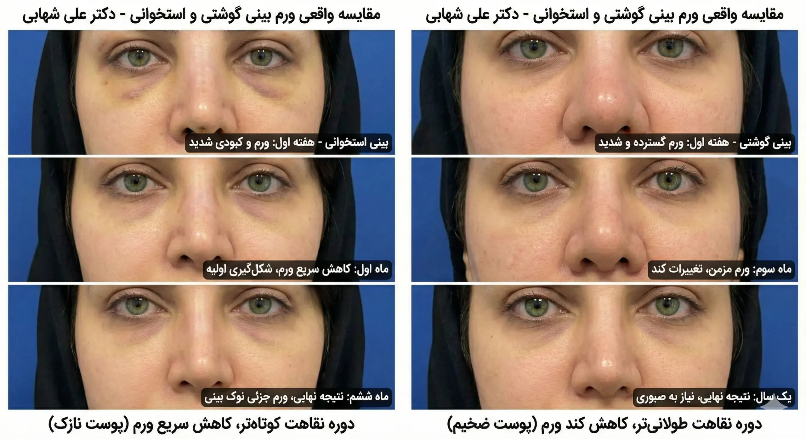 نکته مهم: مقایسه نتیجه خود با دیگران اشتباه است، زیرا هر بینی منحصر به فرد بوده و سرعت کاهش ورم در افراد مختلف متفاوت است.